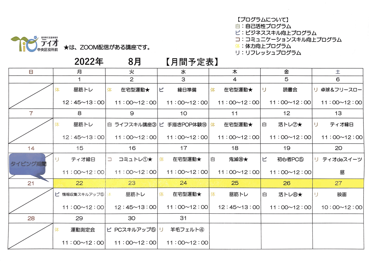 ティオ中央区役所前8月のスケジュール