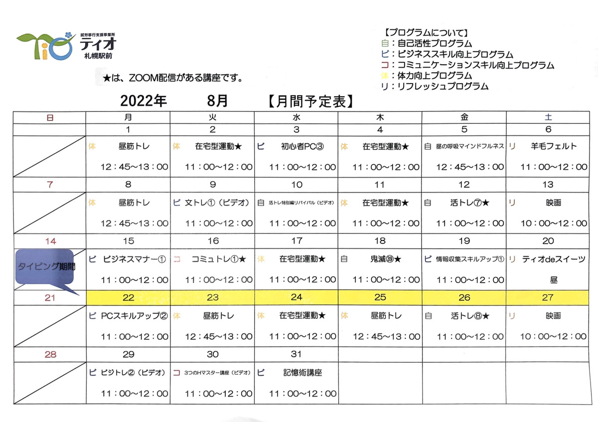 ティオ札幌駅前8月スケジュール