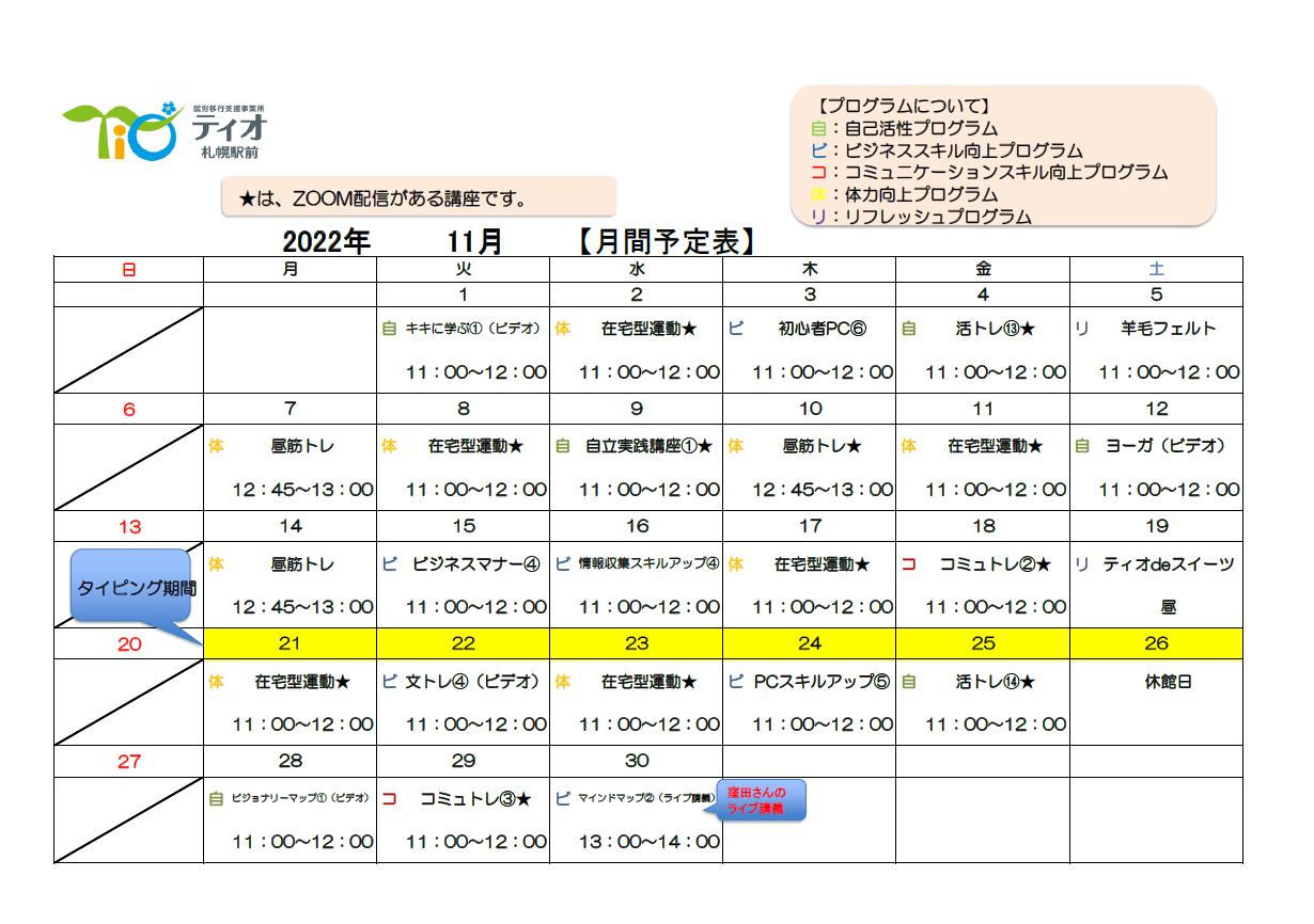 ティオ中央区役所前・札幌駅前の11月の予定が決まりましたのでお知らせいたします!