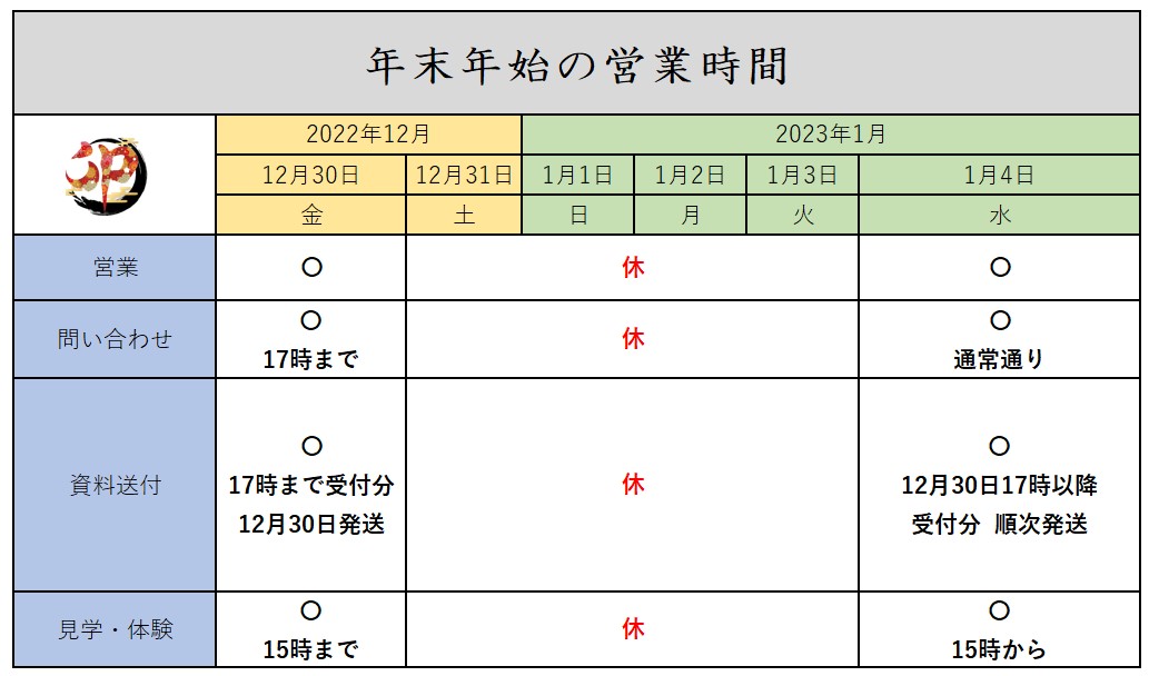 2022年 12月31日~ 2023年 1月3日の期間を、閉所日とさせていただきます。